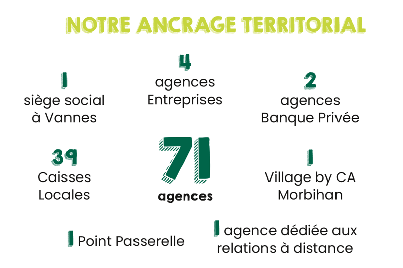 Acteur majeur de l’économie locale avec plus de 400 000 clients, le CA 56 bénéficie par ailleurs, d’un maillage local fort. Aujourd’hui, nos 1 322 collaborateurs sont déployés sur près de 80 agences de proximité, étendues sur l’ensemble du département, et son siège social, situé à Vannes.